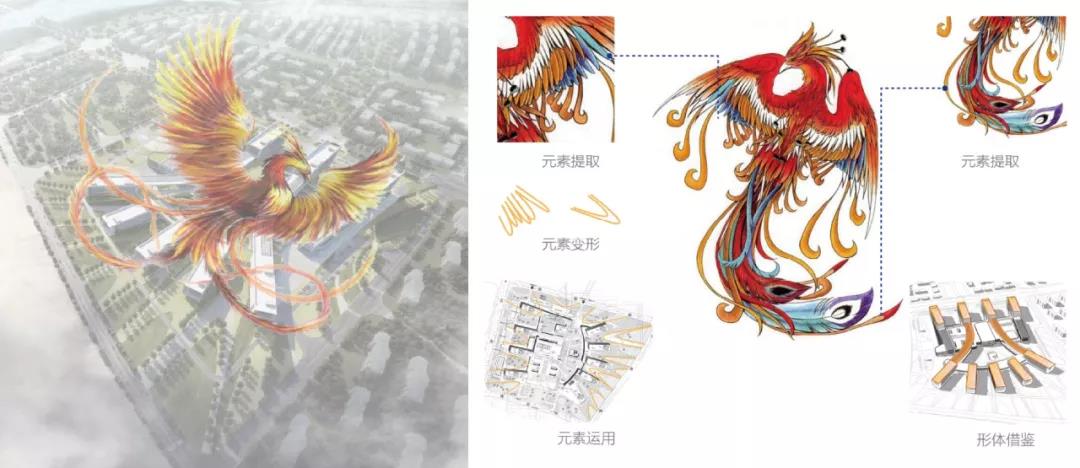 日出東方、火鳳騰飛——方案延續當地對太陽的崇拜及鳳凰城遺址的歷史文化積淀,取意象征太陽的神鳥鳳凰,將鳳凰羽翼和尾翼的線條進行提煉演變,形成建筑和景觀的構成元素,表達了對歷史和文化的呼應。