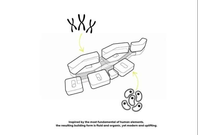 建筑的設計理念源自大自然最基本的生命元素——細胞。南側門診樓和行政樓被賦予細胞狀的外觀;北側建筑體塊的排布則模擬了細胞內染色體的形態。建筑的朝向和角度與河道景觀交相呼應,呈現出律動的美感。